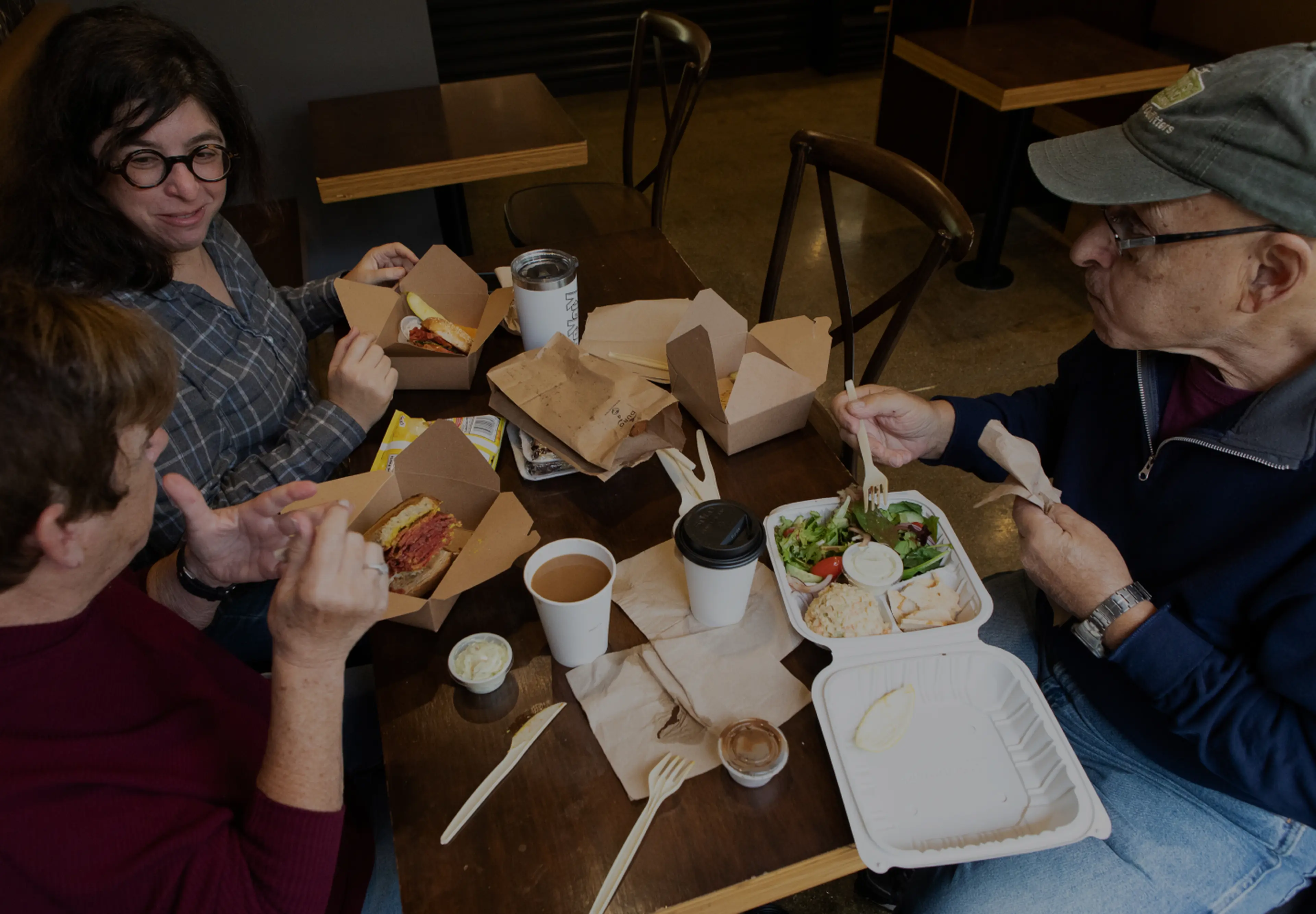 Ready to order, Al goes for a salad with a scoop of tuna and a toasted bagel with cream cheese. Sandy, sporting a mere 72 years of deli-eating experience, gets a corned beef sandwich on rye. They agree that the texture of the corned beef feels accurate but could use a little more salt. (I got a bagel sandwich with lox and dill-pickle cream cheese, by the way.)